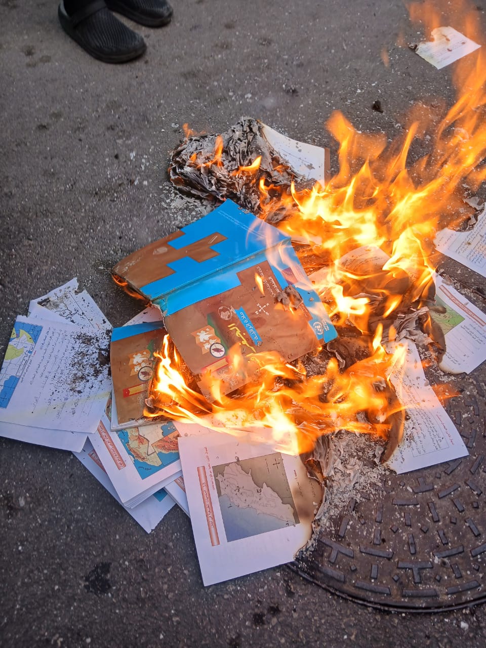 ومخيم عين الحلوة، فقد أقدم طلاب وأهالٍ على إحراق نسخ من كتاب الجغرافيا المخصّص