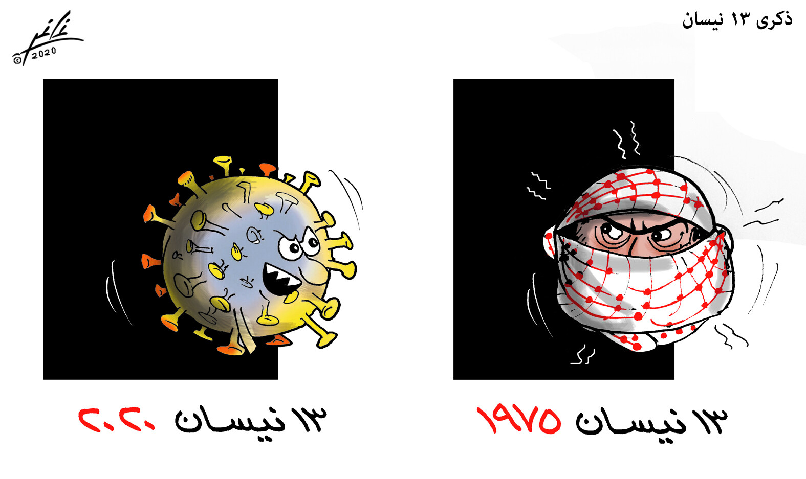 ويساوي الكاريكاتور الذي جاء بمناسبة مرور الذكرى الـ45 لاندلاع الحرب الأهلية اللبنانية، بين الفلسطيني في تلك الحقبة وفيروس "كورونا" في هذه الأيام، ما أثار حفظية الفلسطينيين وكثير من اللبنانين على حد سواء.